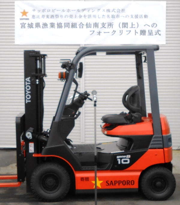 サッポロホールディングス(株)は、東日本大震災で甚大な被害を被った宮城県名取市閖上地区の水産業復興のため、宮城県漁協仙南支所(閖上)にバッテリー式フォークリフト1台を寄贈しました。
