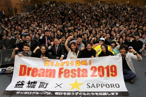 熊本地震から3年が経過した今も、仮設住宅やみなし仮設住宅で多くの町民の皆様が不自由な生活を余儀なくされています。このような状況をうけ、4月4日に益城町の子供から大人まで多くの被災者の方々に元気と夢を届け、参加者全員で盛り上がる事業として、『“盛り上がろう益城”ドリームフェスタ2019』が開催され、町民933名が無料招待されました。