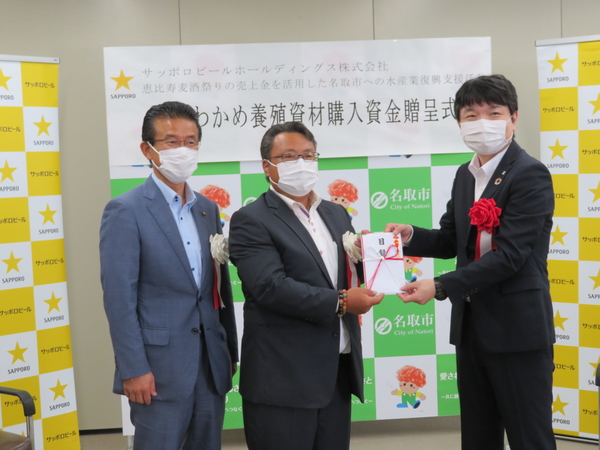 サッポロホールディングス(株)は、宮城県漁協仙南支所(閖上)に対し、「閖上わかめ」養殖プロジェクト推進のため、養殖設備購入資金の一部として200万円を寄付しました。
