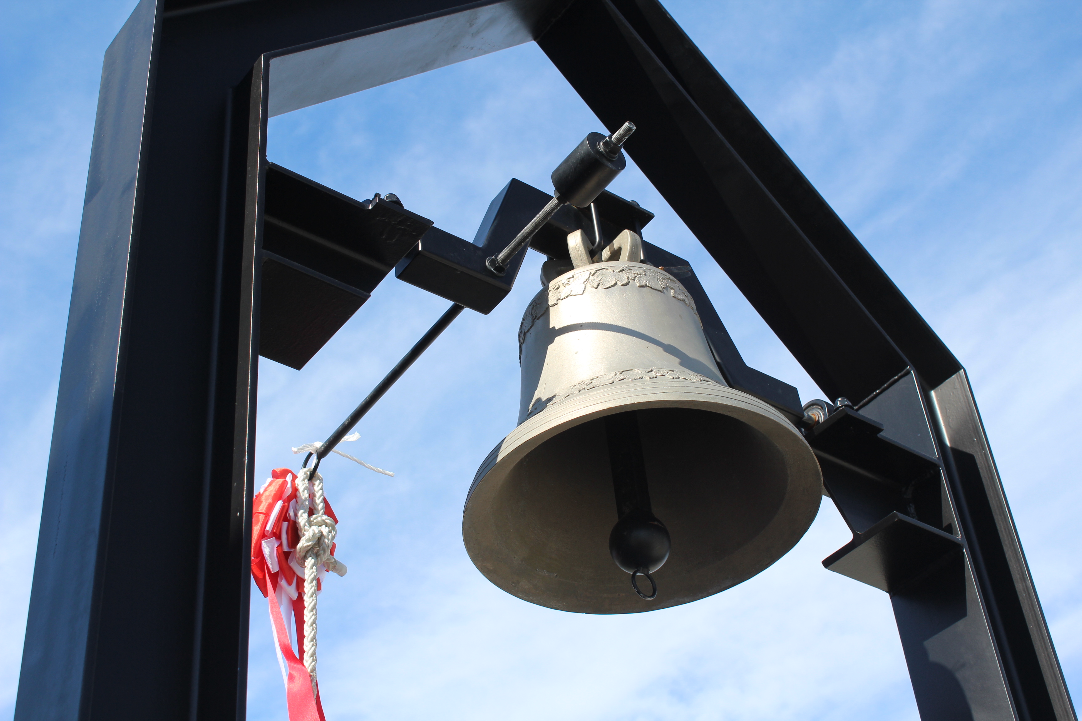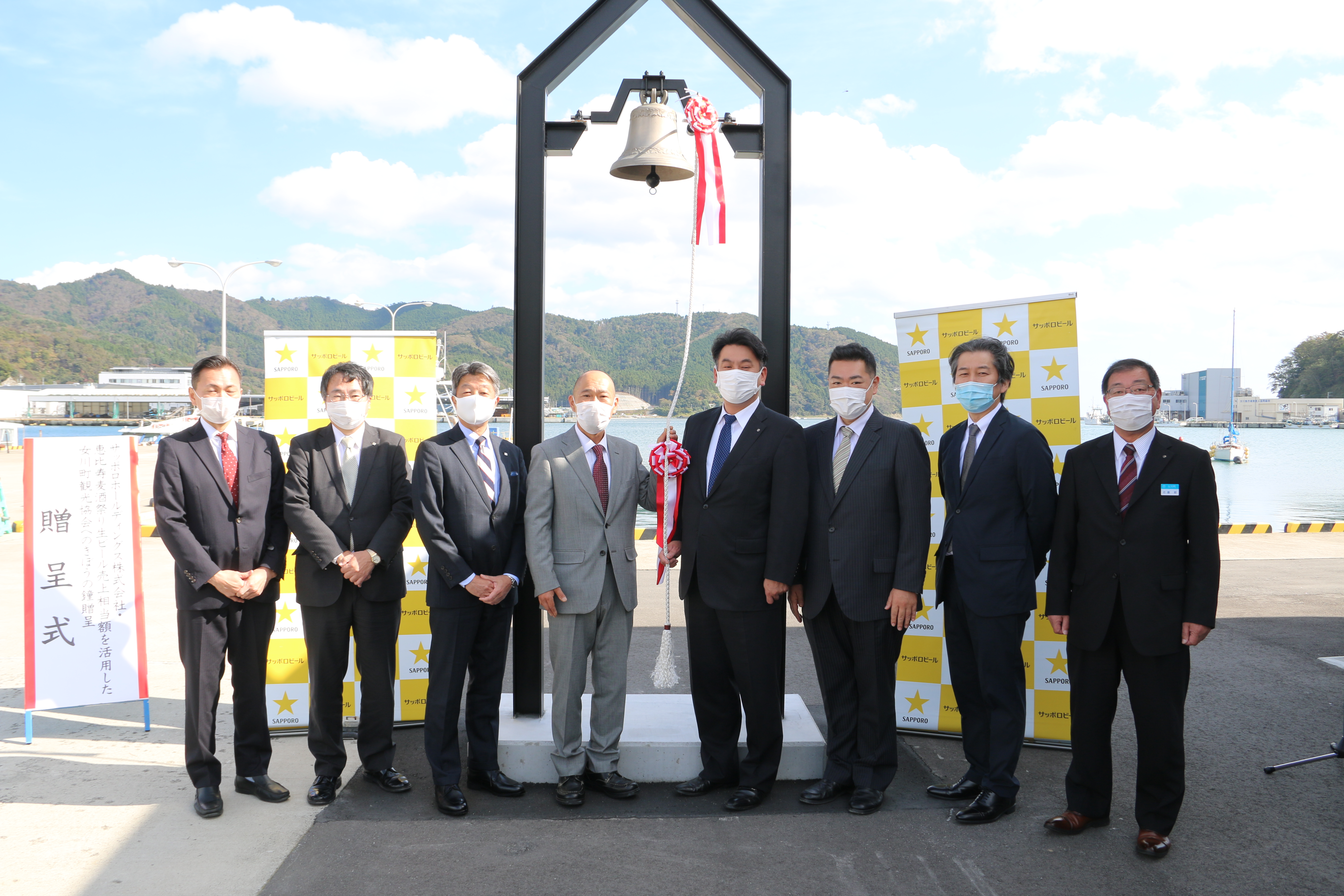 サッポロホールディングス(株)は、(一社)女川町観光協会へ3基目の「きぼうの鐘」(注1)を贈呈しました。観光客で賑わう女川駅前プロムナード沿いハマテラス向かいに設置した1基目、女川町役場東日本大震災慰霊碑側に設置した2基目に続き、3基目は女川湾を一望する女川町離島航路ターミナル脇に設置します。新しい町づくりが進む女川町の復興の象徴として、地域のみなさまの心のよりどころとなることを願っています。