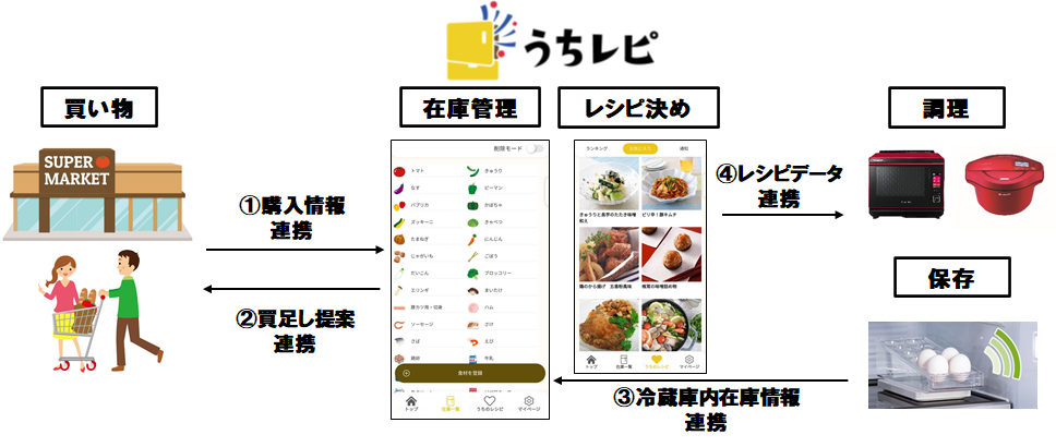 ①購入情報連携:スーパーマーケット等でのお買い物情報を、「うちレピ」の食材在庫として取得します。