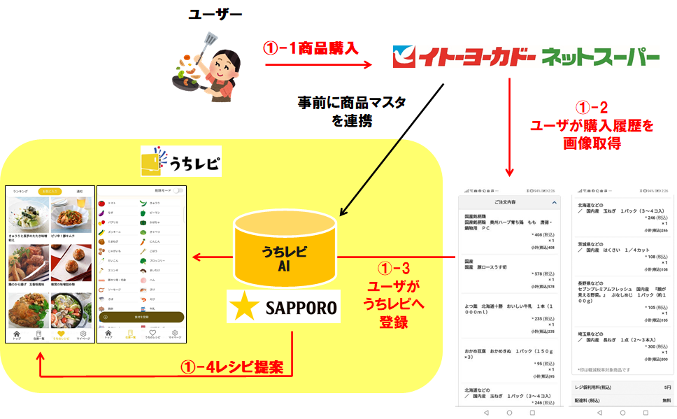 「うちレピ」は、イトーヨーカ堂が運営する「イトーヨーカドーネットスーパー」と連携し、2021年7月1日~8月31日の期間において、「①購入情報連携」に関する実証実験を、イトーヨーカドーネットスーパー西日暮里店限定で行います。ユーザーはイトーヨーカドーネットスーパー西日暮里店で購入した食材情報を画像などで「うちレピ」のアプリに登録することで、購入して届いた食材と自宅にある食材とを組合わせてつくれるレシピの提案を、「うちレピ」から受けることができます。