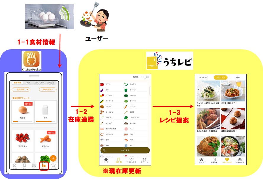 ③冷蔵庫内在庫情報連携:専用機器で取得する冷蔵庫内の特定商品の在庫情報を、「うちレピ」の食材在庫として取得します。