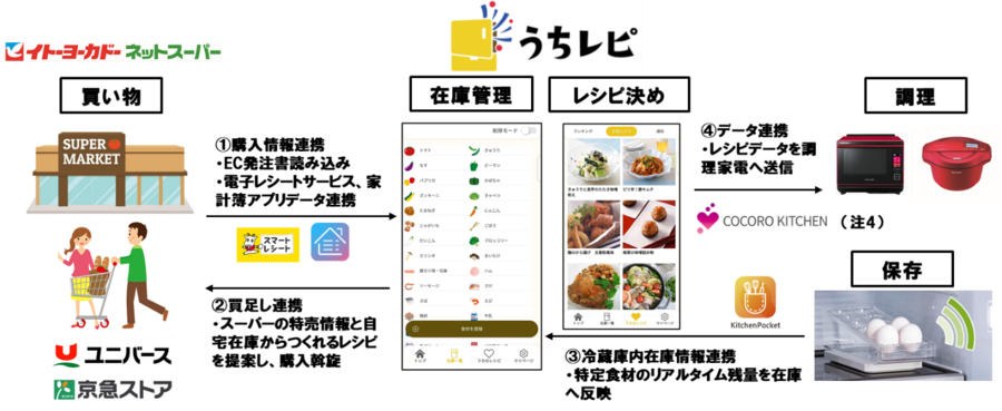 ①購入情報連携:スーパーマーケット等でのお買い物情報を、「うちレピ」の食材在庫として取得します。