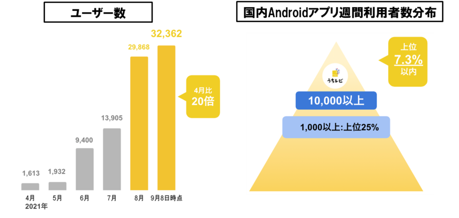 「うちレピ」のβ版webアプリは、2021年1月のリリース以降ユーザー数を順調に伸ばし、9月時点では32,000名を突破しました。さらに、目標としていた週間利用者数10,000名(注9)を突破しました。リリースから8か月で国内Androidアプリの上位8%の水準まで到達しており(注10)、アプリとしての市場受容性を確認できました。