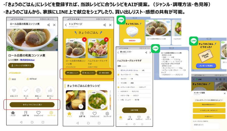 また、家族でご利用いただくことで食材在庫やお気に入りのレシピをシェアしたり、「とてもおいしかったよ」「今度、これ作ってみたい」といったコメントを残せるなど、料理に関するコミュニケーションをとることができます。