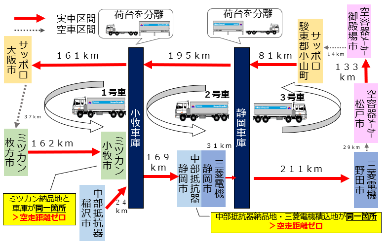 本取り組みは、業界を超えた荷主5社の貨物を、運送事業者である鈴与の荷台と車体の切り離しが可能なスワップボディ車を活用して、千葉~大阪の中間地点に位置する静岡県静岡市・愛知県小牧市の2拠点で中継輸送を行うことで、長距離輸送を無くしました。この共同連携輸送により、輸送車両台数の削減や実車率の向上、作業時間および待機時間の削減を図り、環境負荷の低減に加え、ドライバーの労働環境改善を同時に実現しました。