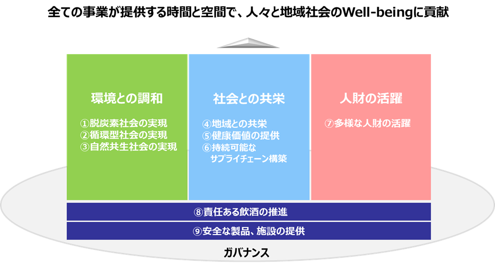 サッポロホールディングス(株)は、中期経営計画(2023~26)の策定にあたり、グループを取り巻く社会情勢や事業環境の変化に対応してサステナビリティ重点課題を全面的に見直しました。