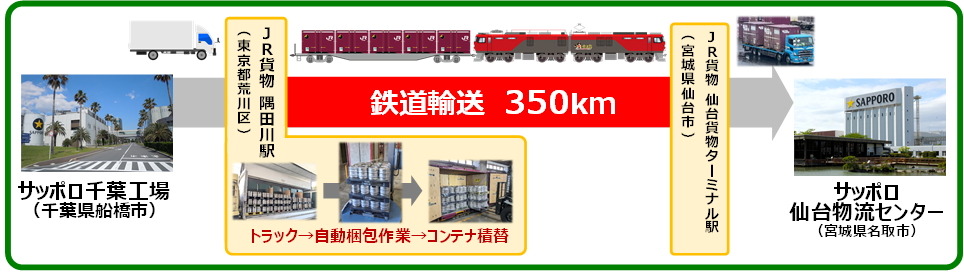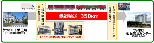 サッポロビール千葉工場(千葉県船橋市)→JR貨物隅田川駅(東京都荒川区)→JR貨物仙台貨物ターミナル駅(宮城県仙台市)→サッポロビール仙台物流センター(宮城県名取市)
