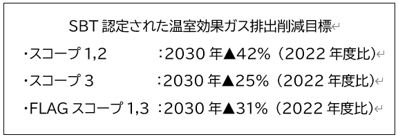 (注1) SBTiは、2015年にCDP、国連グローバル・コンパクト、WRI(世界資源研究所)、WWF(世界自然保護基金)によって共同設立された国際的なイニシアチブであり、企業が設定する温室効果ガス排出削減目標が、科学的根拠に基づいて世界の気温上昇を1.5℃未満に抑えるための目標となっているかを検証し、基準を満たす目標に対して認定を行っています。