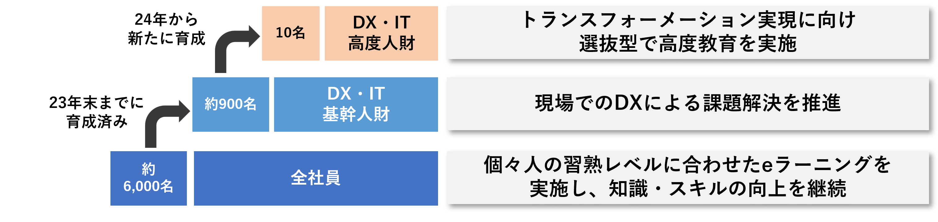 このプログラムは2022年に始動した人財育成プログラムであり、2年間で、全グループ会社社員約6,000名(注1)のDX基礎リテラシー向上と、DX・IT 基幹人財 900 名の育成を完了しました。