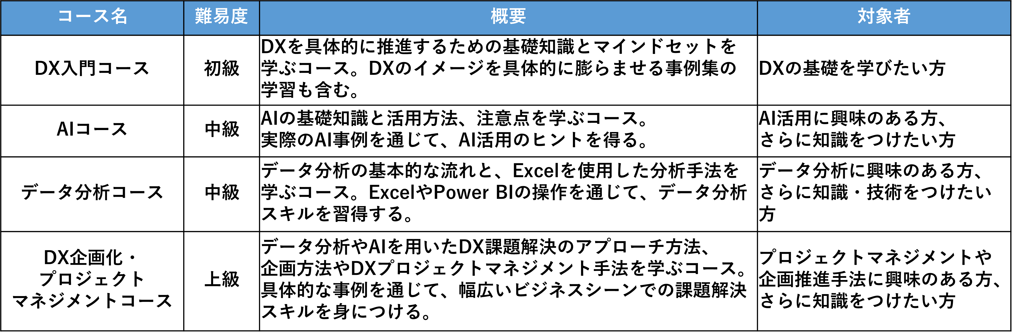 実践的な内容を盛り込むとともに、受講者の習熟レベルに合わせたコース選択を可能にし、DX成果創出の早期化を目指します