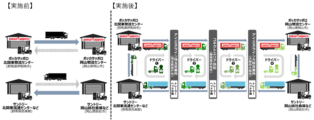 従来サッポログループ物流(株)とサントリーグループは群馬県~岡山県間の往路の輸送手段としてトラックを両社それぞれで手配し、製品を輸送していましたが、復路の積み荷確保やドライバーの拘束時間短縮が課題となっていました。